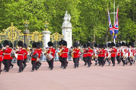 London, England - April 4, 2017: Royal Guards parade during traditional Changing of the Guards ceremony near Buckingham Palace. This ceremony is one of the most popular tourist attractions in London.