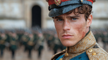 Regal Christmas Parade A traditional cavalry parade on Christmas, showcasing regal uniforms and majestic horses against a backdrop of historical buildings.Background