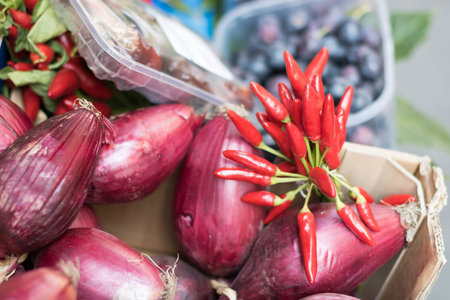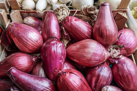 Fresh red onion in the stand in a street market in Palermo, Italy