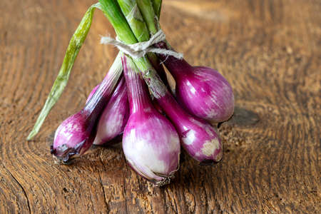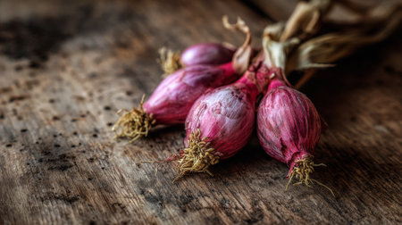 Vibrant fresh shallots rest on a rustic wooden table, showcasing the natural beauty of organic vegetables. Perfect for culinary uses and healthy cooking.