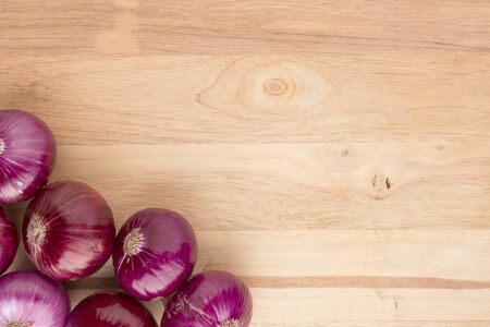 Close up of fresh red onion on wooden background. Selective focus.