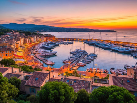 View of the city of Saint-Tropez in the sunset light, Provence. Cote dAzur, a popular travel destination in Europe