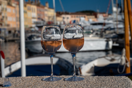 Glasses of cold french rose Cote de Provence wine in old fisherman boats port and yachts harbor in Saint-Tropez, summer vacation on French Riviera in Provence, France