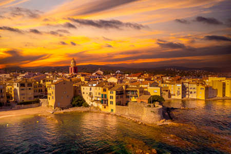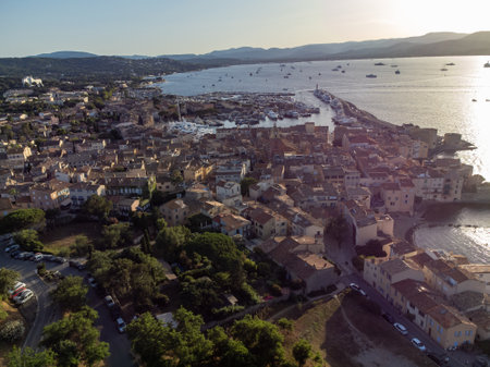 Aerial view on bay, hills,, old citadel fort, olorful houses of famous Saint-Tropez town on French Riviera at sunset, Var, Provence, France, summer vacation destination