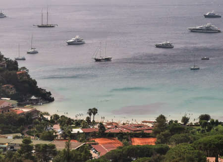 Mediterranean bay with sailing yachts at anchor. Saint-Tropez gulf, provence Cote d'Azur, France.