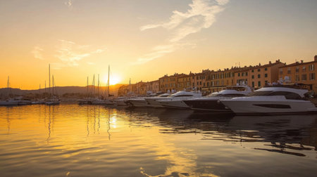 A stunning sunset casts warm hues over a coastal marina filled with elegant yachts. The tranquil waters reflect the colorful buildings, creating a picturesque scene perfect for travel inspiration.