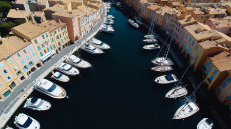 A stunning aerial view of a serene marina in a colorful coastal town. Yachts and boats are peacefully docked, reflecting the vibrant surroundings.