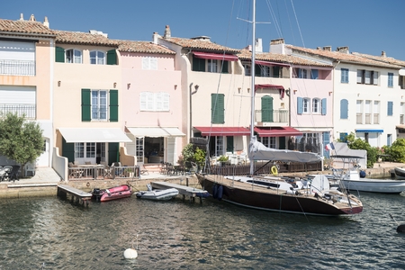 Saint-Tropez, France - July 08, 2009: Behind the marina there are houses located right on Mediterranean Sea. The place is one of the most visited and glamorous towns on the French Riviera.