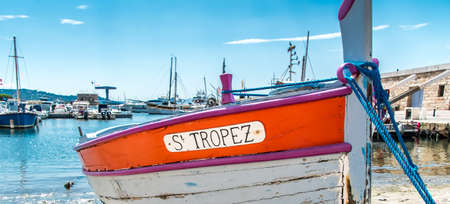 Old boat moored in Saint-Tropez, France, with the text St. Tropez written in it.