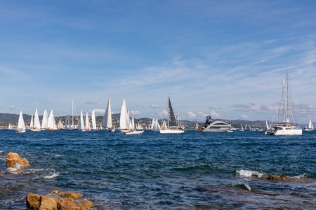 05 OCT 2019 - Saint-Tropez, Var, France - Sailboats in the bay during the 2019 edition of 'Les Voiles de Saint-Tropez' regatta