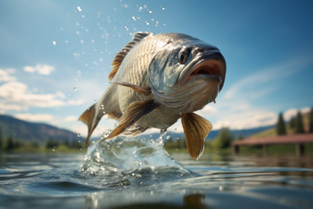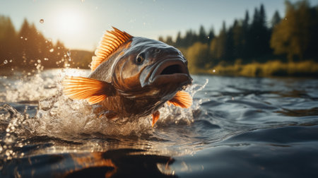Gentle splash of fish jumping out of water captured in mid-air , Professional stock photo, AI generated photograph