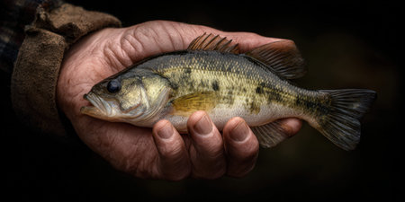 Fisherman's hand gripping a fresh largemouth bass, detailed scales and fins visible on this close-up from a freshwater angling trip, outdoor sport fishing success