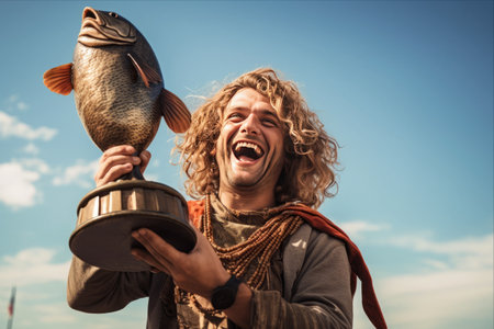 a man showcasing his catch of a fish, exuding an air of understated sophistication. this captivating photo, captured with the vibrant colors of provia film, features a delightful combination of light crimson and teal. the prairiecore aesthetic is enhanced by the use of the rodenstock imagon 300mm f58 lens, resulting in realistic detailing that beautifully complements the stunning australian landscapes. ai generated