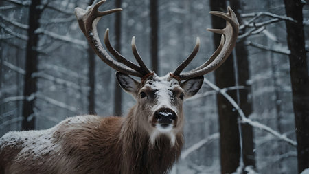 Majestic deer stands proudly in snowy forest during winter snowfall under soft, diffused light