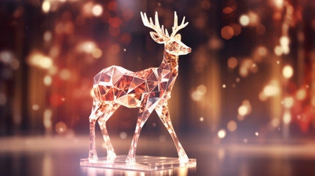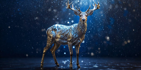 A golden reindeer figurine stands against a backdrop of colorful bokeh lights, creating a festive and magical holiday scene.