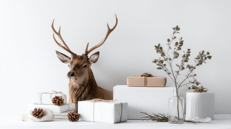 This serene and stylish composition features a deer head surrounded by beautifully wrapped gifts, pinecones, and delicate greenery, perfect for festive decor.