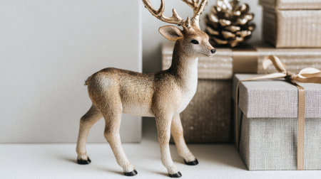 This image features a beautiful deer figurine with intricate details, standing among elegant gift boxes and a decorative pine cone, ideal for holiday decor themes.