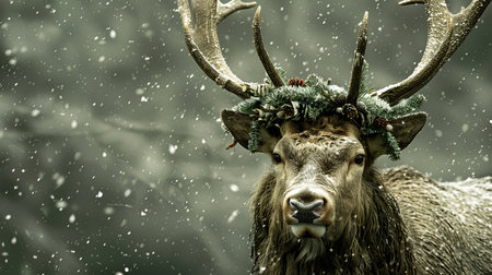 Majestic Red Deer Stag Adorned with Festive Christmas Garland, Standing in a Snowy Winter Forest.