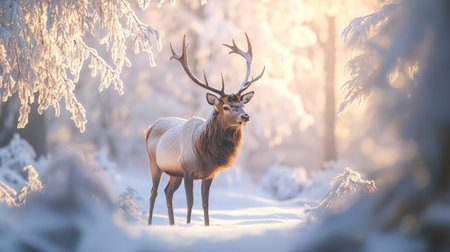 A majestic elk stands gracefully in a stunning snowy forest, surrounded by frosty trees and soft sunlight, capturing the beauty of winter wildlife.