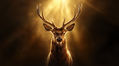 The elegant deer stands gracefully with branching antlers, surrounded by tranquility and offering a perfect backdrop for design projects.