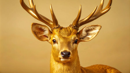 Golden deer with large antlers looking directly at the camera against a beige background.