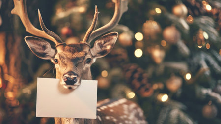 Close-up of Reindeer in Snow with Antlers Holding a Blank White Card. Concept of Deer, Winter, Christmas, Holiday Greetings, Wildlife. Greeting card, postcard, mockup, invitation, letter. Copy space.