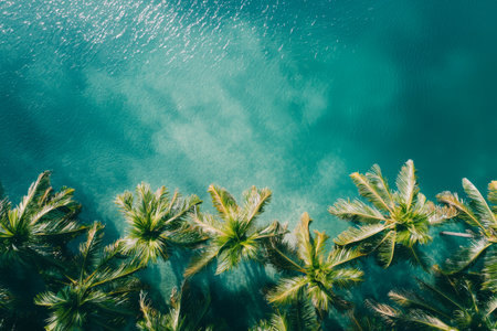 Experience a breathtaking aerial view of a tropical paradise featuring soft sandy beaches, lush palm trees, and stunning turquoise waters. Ideal for travel themes.