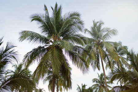 A grove of palm trees and sky with clouds in summer day on the coastline. Holidays in the tropics. High quality photo