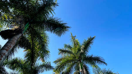 A low angle shot of beautiful palm trees under the clear blue sky