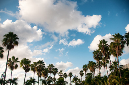 Palm trees against blue sky with clouds. Vintage style toned picture