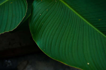 Closeup of large tropical plant leaf texture. Two leaves with visible grooves lines.
