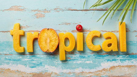 Fresh tropical fruits spell tropical on beach themed surface Bright colors evoke warmth