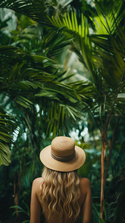 A woman with flowing hair and a straw hat embarks on an adventure through a dense jungle, immersing herself in the sights and sounds of nature while surrounded by tall palm trees.