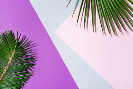 Tropical palm leaves on pastel pink and blue background. Minimal summer concept