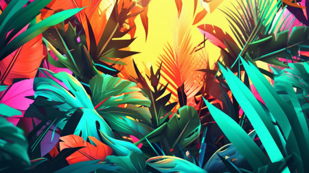 Vibrant tropical rainforest foliage with bold colors and sparkling textures