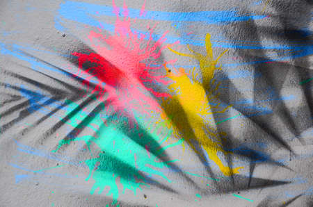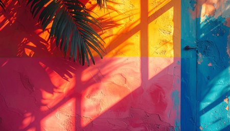 Colorful wall with shadow of palm leaves. Abstract background and texture.