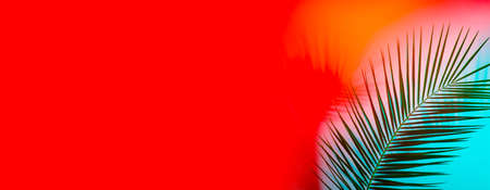 Palm leaves lay down on blue and red background. Minimal flat lay composition with copy space, tropical calming decorative concept