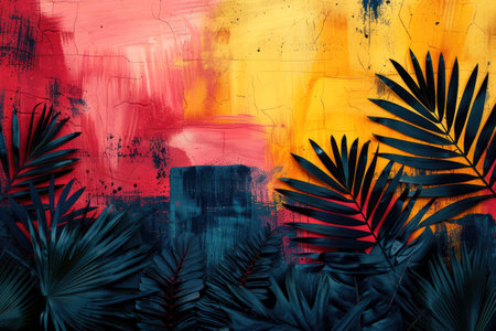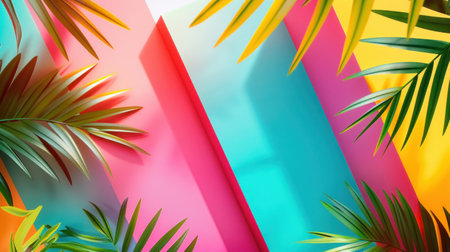 Tropical palm leaves against vibrant geometric background illustration design