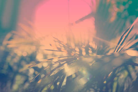 Blur nature tropical palm leaf with bokeh sun light abstract background.Retro color style.