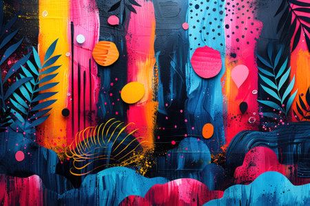 Lush tropical plants stand out against a colorful abstract backdrop, showing a vibrant mix of greens, pinks, and blues, creating a lively indoor atmosphere filled with energy.