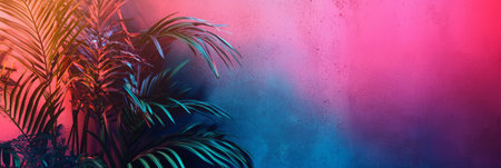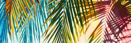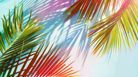 Palm leaves on a colorful gradient background reflecting sunlight, suitable for vibrant tropical themes. With Generative AI technology.