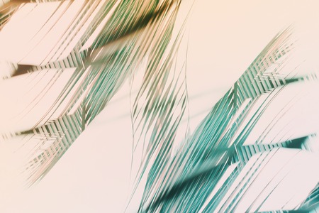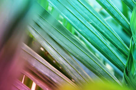 Green palm leaves with bokeh photo effect and inverted colors. High quality photo