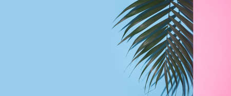 Green palm leaf peeping with cardboard pink background looks on a blue background. Top view, flat lay. Banner.
