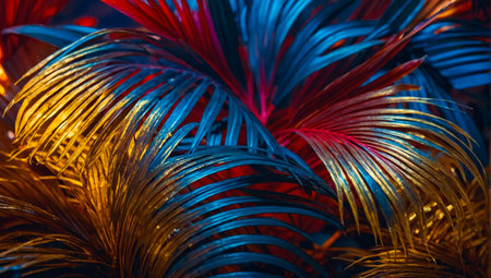Dynamic closeup of tropical palm leaves with vivid red, yellow, and blue lighting. Nature meets art in an exotic spectacle, showcasing vibrant colors and lush foliage