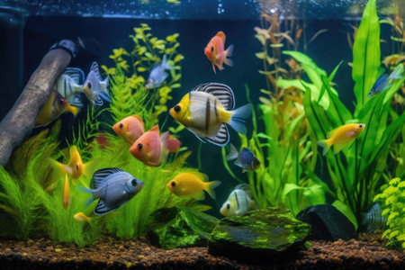 tropical fish tank with colorful and unique fish species swimming peacefully, created with generative ai