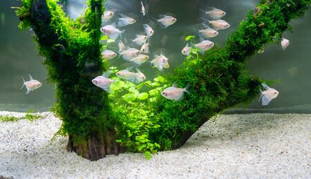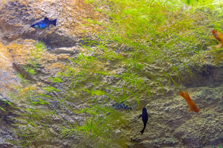 Underwater world of aquarium. Plants and fish in freshwater aquarium. Natural background Natural habitat. Home hobby.