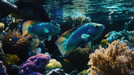 Explore a stunning underwater scene featuring vibrant fish swimming gracefully among colorful coral reefs. This captivating marine habitat showcases the beauty and diversity of ocean life.