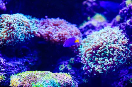 Beautiful aquarium with different types of fish and corals in the neon light in Prague, Czech republic