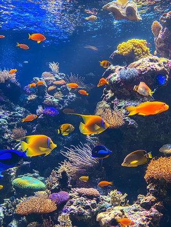 An aquarium scene with diverse colorful fishes swimming amongst the coral formations and aquatic life.