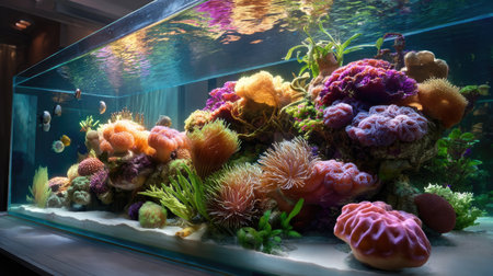 A stunning aquarium filled with an array of colorful corals and diverse marine life creates a tranquil underwater scene. Perfect for any nature lover.